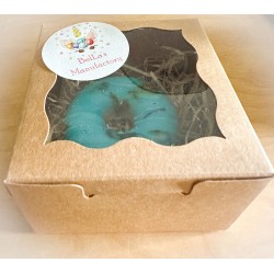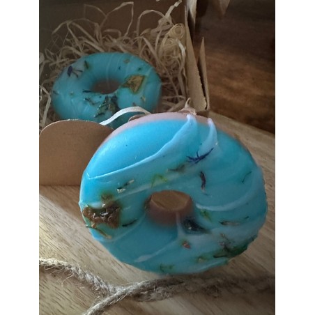 Handmade donut-shaped soaps in blue, with a soft wheat fragrance. Packed in cardboard or wooden box - ideal as a gift or self-care treat. Diam. 7cm