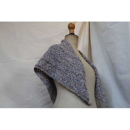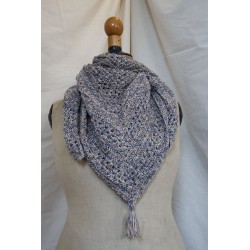 This hand-crocheted triangular scarf in shades of blue and cream is a versatile accessory for every season. Made from a high-quality wool-cotton blend, perfect for winter layering, ideal in spring and autumn, and a lovely alternative to a light jacket on cool summer evenings, a stylish touch to any outfit all year round.