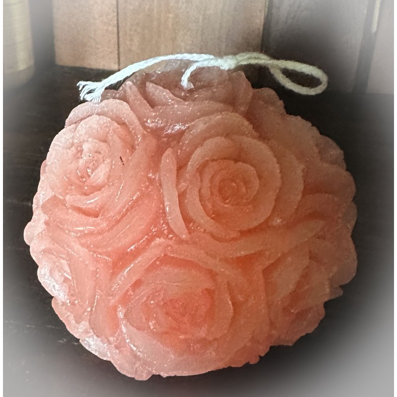 Bougie artisanale en forme de sphère avec motif de roses. Sans parfum - idéale pour profiter de la lueur naturelle de la bougie. Un objet décoratif élégant et une idée cadeau originale. Dim. 9cm x 9 cm